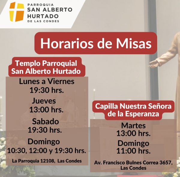 Domingo de Ramos. 29 de marzo de 2026. 10:30 hrs. Santa Misa en Templo Parroquial. La Capilla 12.108 11:00 hrs. Santa Misa en Capilla Nuestra Señora de la Esperanza. Av Francisco Bulnes Correa 3657. Las Condes 12:00 hrs. Santa Misa en Templo Parroquial. La Parroquia 12.108. Las Condes. 19:30 hrs. Santa Misa en Templo Parroquial. La Parroquia 12.108. Las Condes.